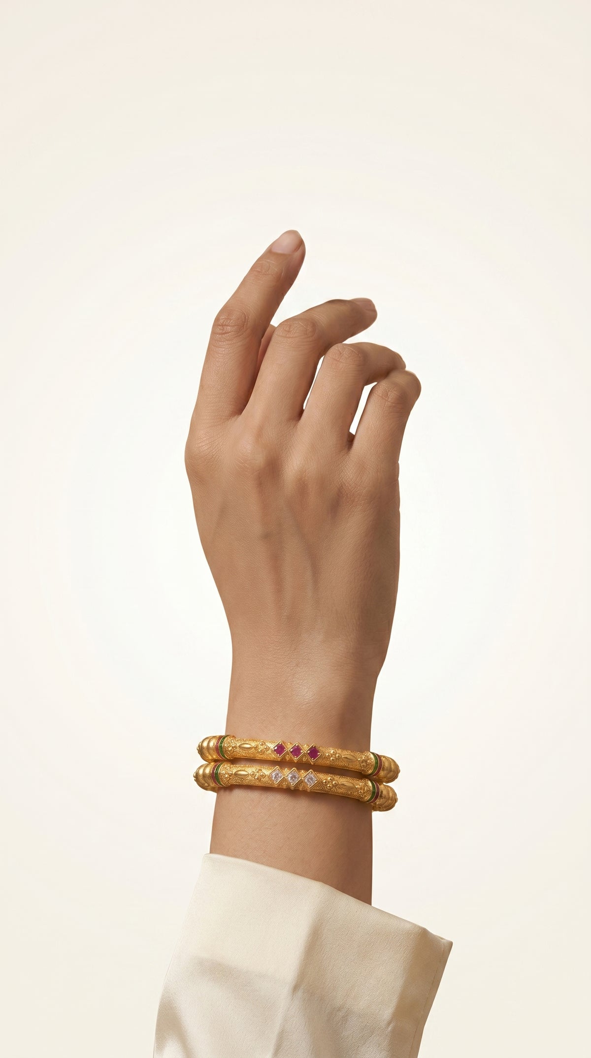 Each bangle is crafted by skilled artisans in Rajkot, Gujarat — India's jewellery capital — carrying forward generations of goldsmithing expertise.